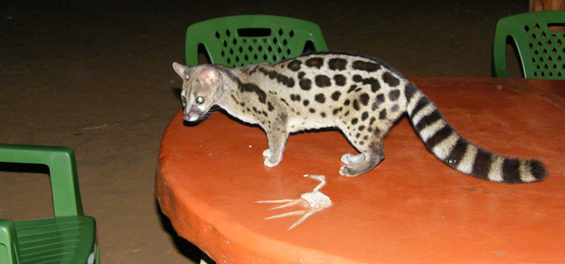 Our regular dinner guest, the genet, cleans the table for us.