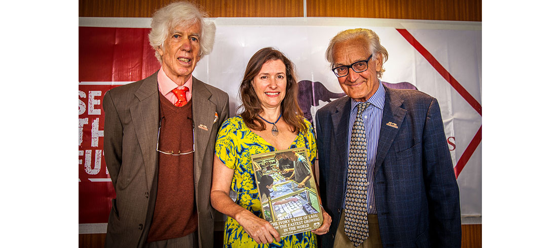 Esmond Martin, Lucy Vigne and Iain Douglas-Hamilton in Nairobi at the launch of ‘The Ivory Trade of Laos: Now the fastest growing in the World’ Report (2017)